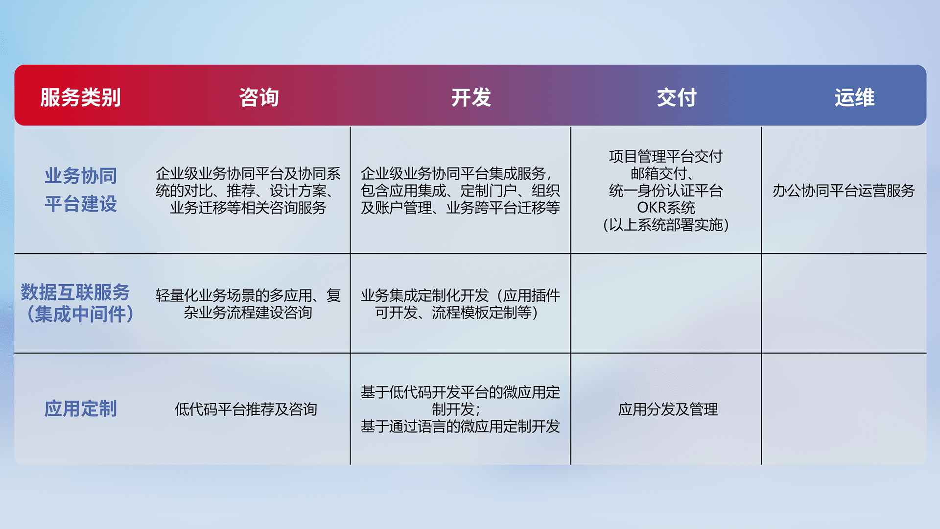 针对钉钉、、企微、、IDaas等平台级产品提供产品的规划、、、方案、、、、交付、、、定制化开发等服务,,,实现如统一协同办公、、、、智能客户服务、、、、混合会议管理、、、、智能数据查询、、、等业务场景,,,,实现数字化转型。。。。